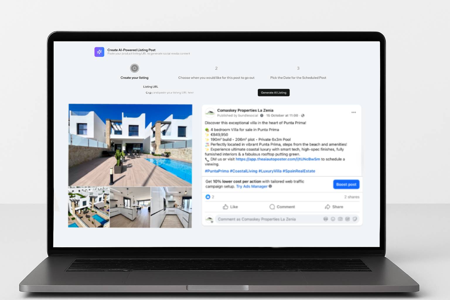 Scrape the photos. Write a scroll-stopping caption. Add the url link. Add Hashtags. Post it automatically to all your social media accounts